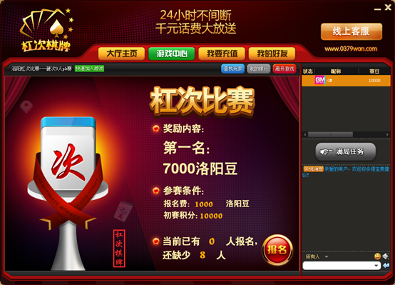 玩家可选择进入“杠次比赛”场,或“斗地主”比赛场。比赛场中又分为不同的比赛场,玩家可根据需要点击参赛,如图: